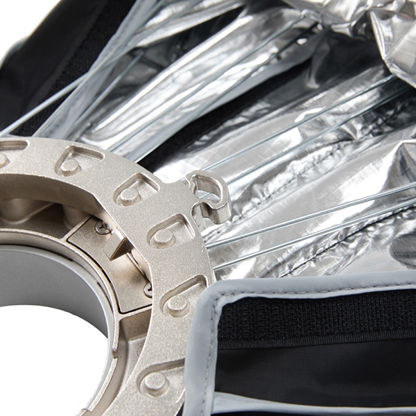 さらに、フラットかつコンパクトに折りたたんで収納・持ち運びが可能な設計を採用しています。硬い点光源を柔らかく拡散し、被写体を包み込むような自然で美しい光を実現します。また、深いパラボリックデザインが均一な光の分布を実現し、高反射シルバー内面により光出力を最大化。