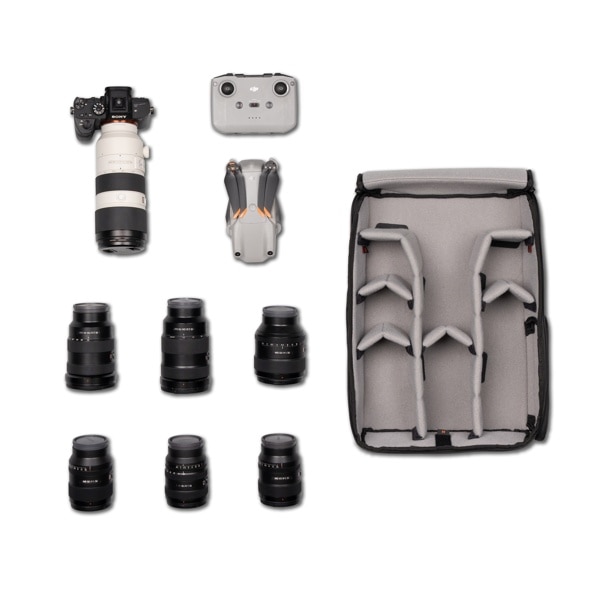 レンズを取り付けたミラーレスカメラ1台、レンズ数本、小型ドローン、アクセサリーなどを収納可能。