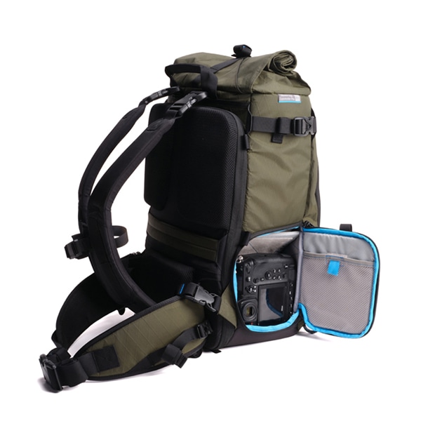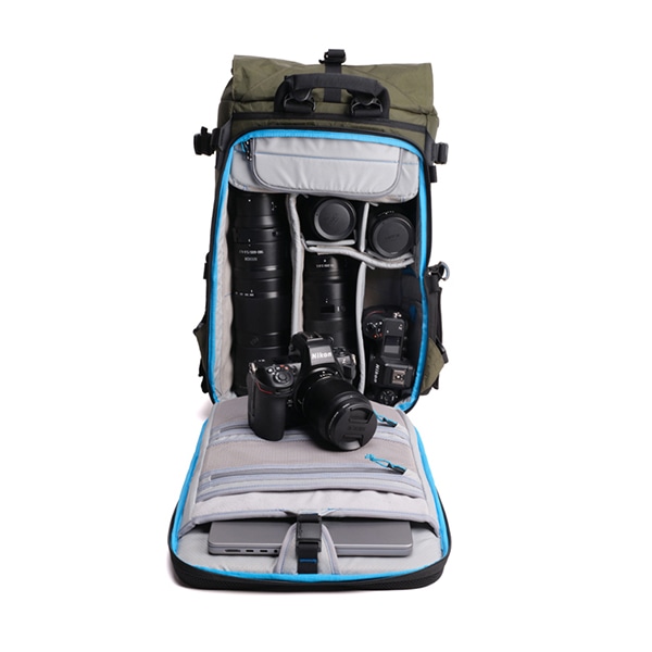 上部がロールトップ型の、多くの収納スペースを必要とするフォトグラファーのためのカメラバックパックです。発売中の「キボコシティ コミューター 18L+」をより深くし、大型の機材のほか毎日の必需品も快適に持ち運ぶことができます。