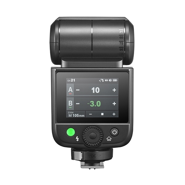最大 1/8000 秒のハイスピードシンクロに加え、ソニー等のグローバルシャッター搭載機種では 1/80000 秒までのシンクロが可能です。また先幕・後幕シンクロにも対応しています。LED のモデリングランプは 10 段階のレベル操作ができます。
