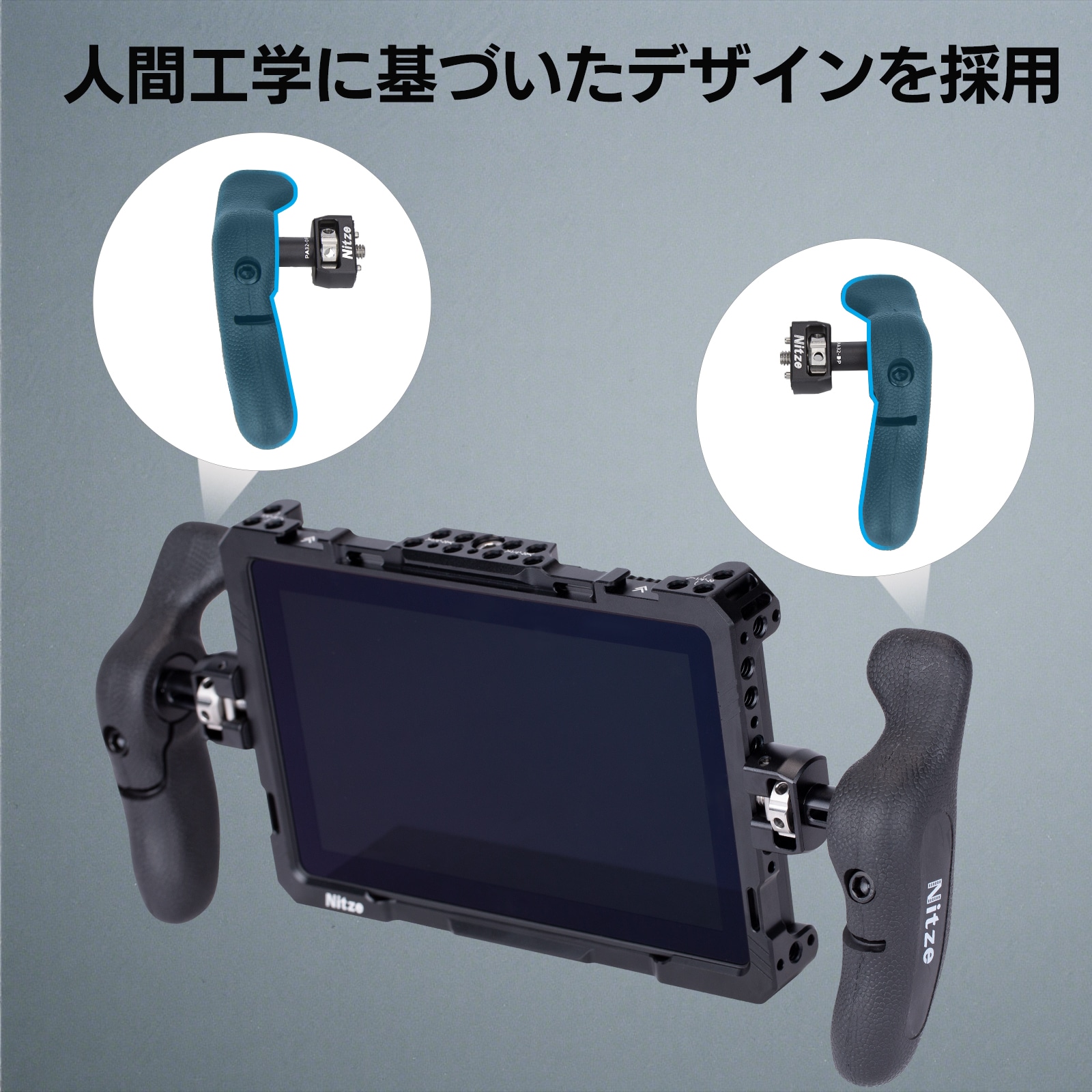 人間?学に基づいたデザインと高い汎用性を兼ね備えた、サイドハンドルキットです。別売りの「G7プロ専用モニターケージ(JT-OE02B)」に取り付けて使用できます。