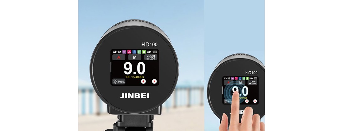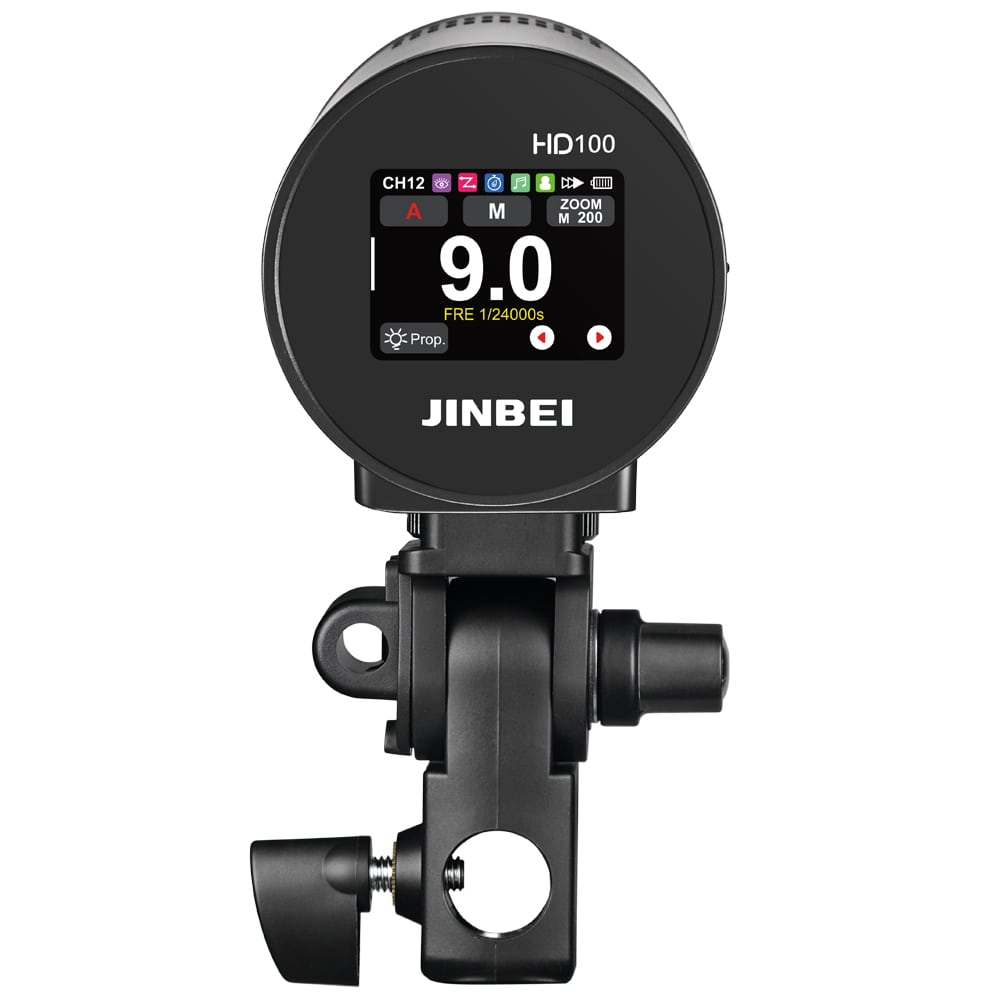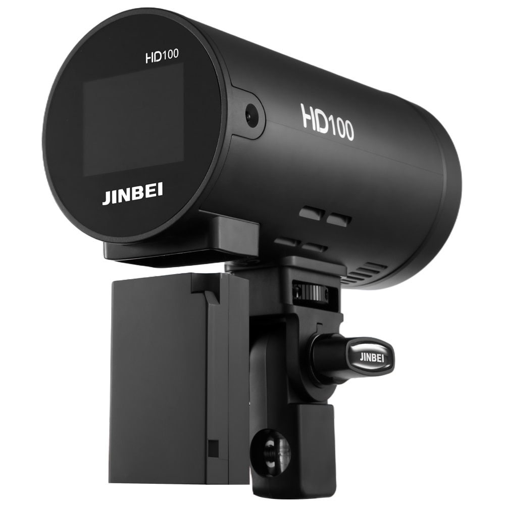 HD100は総重量705gと、JINBEIの中でも最軽量のバッテリーモノライトです。コンパクトなサイズ感ながら出力は100Wsあり、出力レベルは1.0~10(1/512~1/1)で調光できます。