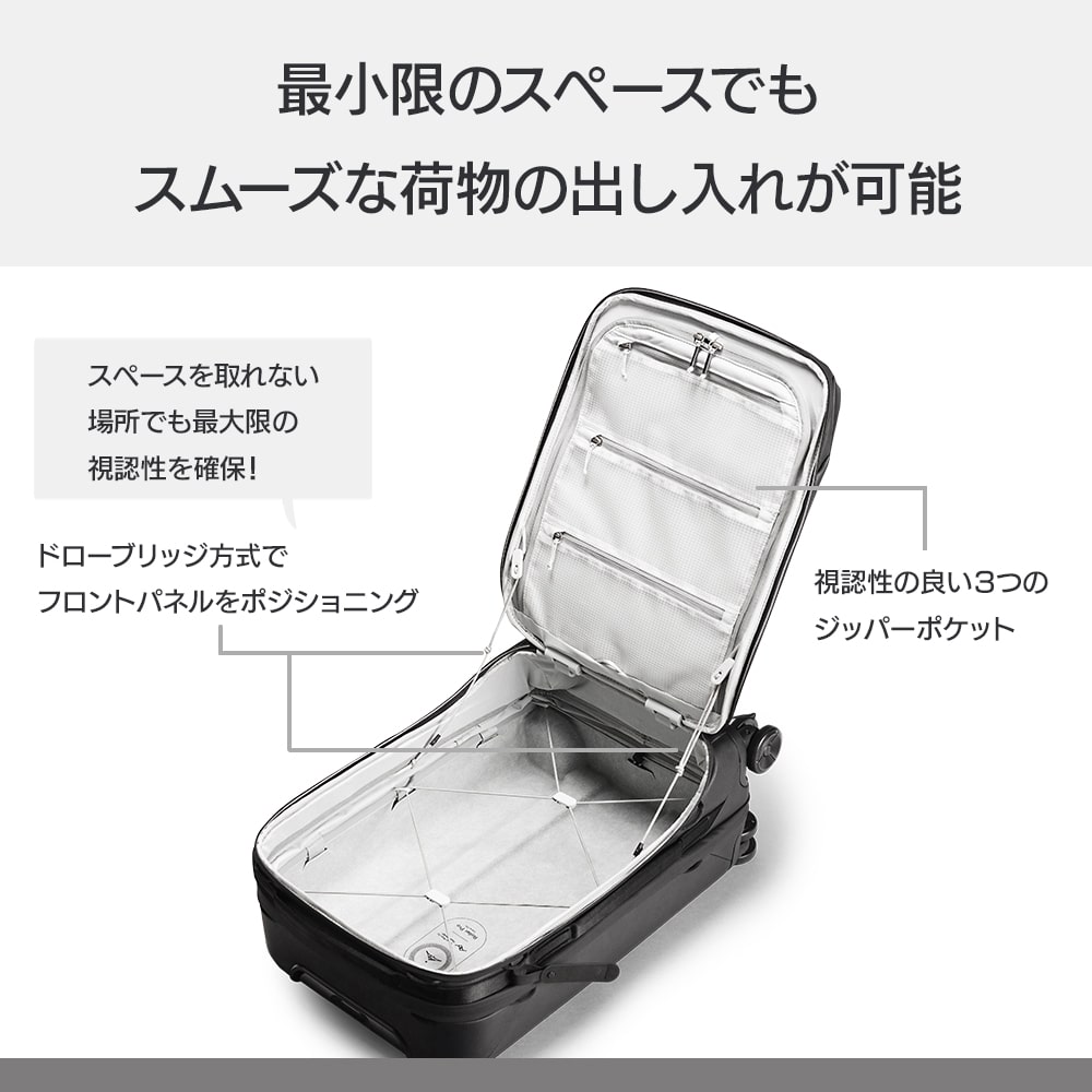 内側の収納スペースを犠牲にしないSlimDrive™(スリムドライブ)ハンドル構造により、コンパクトな外観ながらも34Lという容量で、十分な収納力を確保します。さらに、ケース外側のエクスパンションジッパーを開けて、容量を5L増やすことができます。