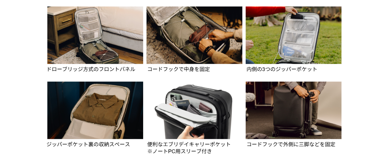 使い勝手も抜群で、省スペースでの荷物の出し入れを可能にするメイン開口部のドローブリッジ構造と、ケース内側と外側に採用している独自のコードフックシステムにより、快適な収納・持ち運びを叶えます。