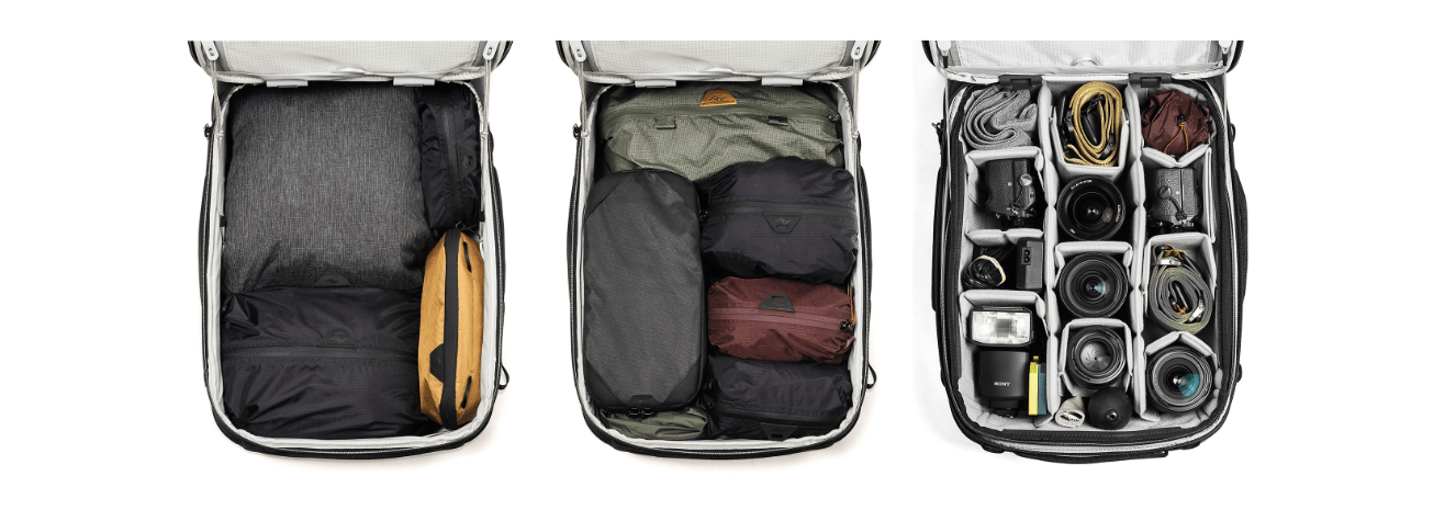 別売りのピークデザイン製「パッキングツール」で、荷物の量や種類に合わせて、バッグをカスタマイズできます。バリエーション豊かなカメラキューブやパッキングキューブ、各種ポーチ類などを組み合わせて、衣類や撮影機材まで、あらゆる荷物を整理しながら収納可能です。