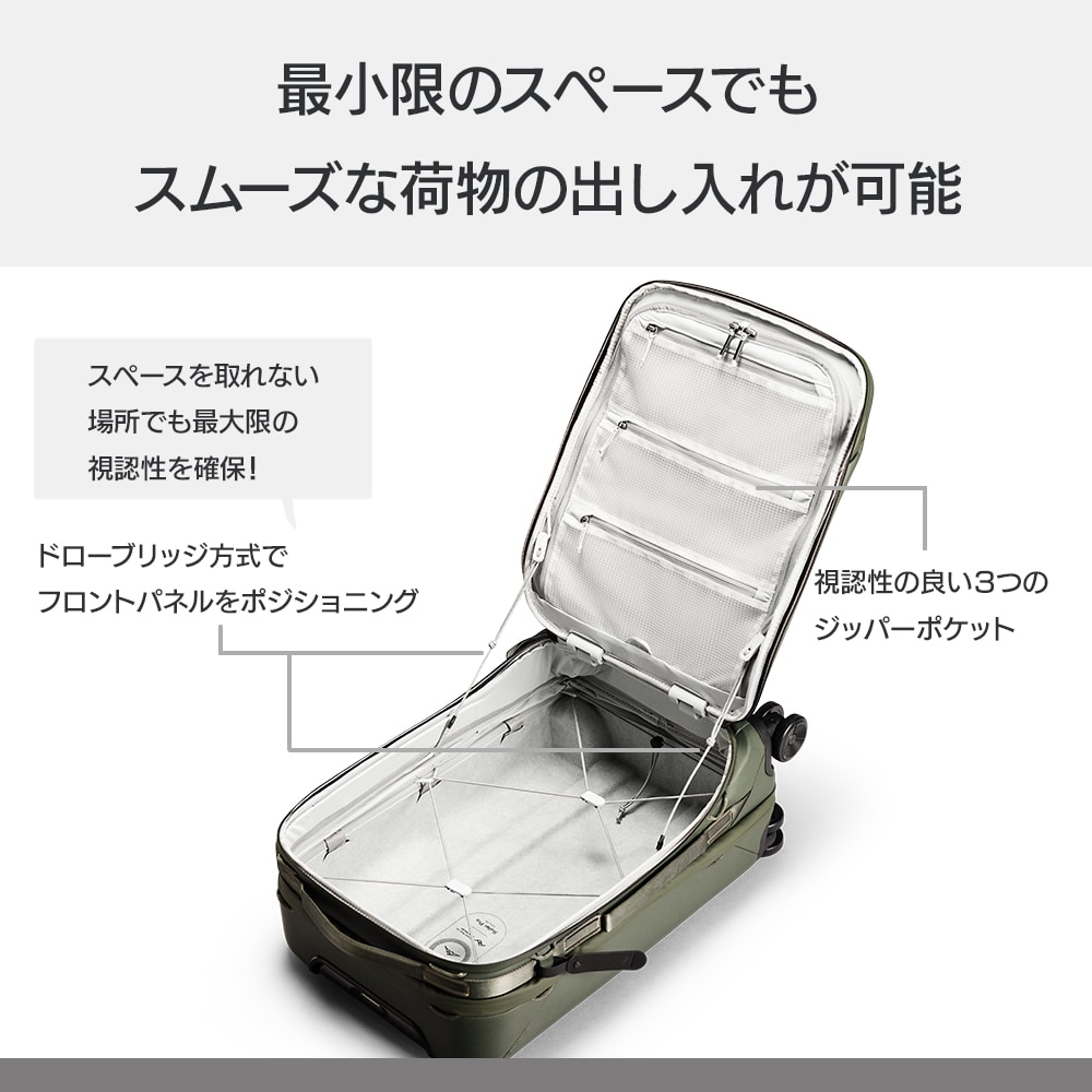 内側の収納スペースを犠牲にしないSlimDrive™(スリムドライブ)ハンドル構造により、コンパクトな外観ながらも34Lという容量で、十分な収納力を確保します。さらに、ケース外側のエクスパンションジッパーを開けて、容量を5L増やすことができます。