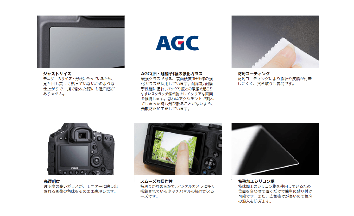 本製品はジャストサイズで仕上げています。採用ガラスは最強クラスの表面硬度(9H)を誇り、透明度 / 耐摩耗 / 耐衝撃性能に優れ、カメラバッグ出し入れ時などに発生するスクラッチ傷を防止し、クリアな画面を維持します。