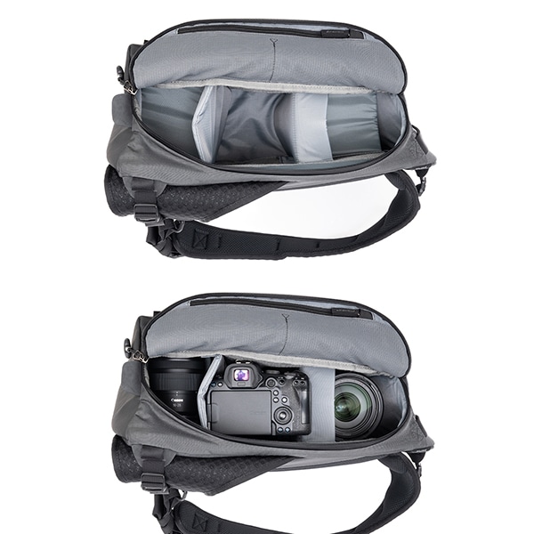 バッグを背中から前面へ素早く回転させるだけで、サイドパネルから機材を取り出せる「スウィングアクセス構造」を採用。バッグを地面に下ろす手間を省き、決定的なシャッターチャンスを逃しません。