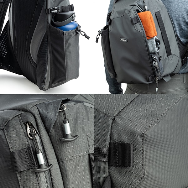 メイン開口部にはYKK製止水ファスナー(AquaGuard®)を採用.本体素材には、環境に配慮したPFASフリーの耐久撥水(DWR)コーティングを施し、シームレスなCORDURA®(コーデュラ)ナイロン製のベースおよびフロントパネルを組み合わせています。また、悪天候時に機材を完全に保護するシームシール処理済みレインカバーも標準装備しています。