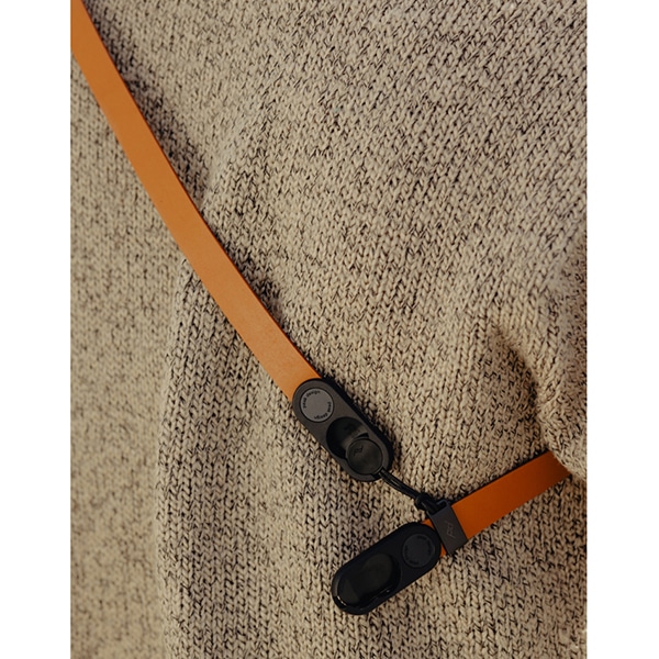 ストラップの裏側には独自のシーリング加工が施され、体に沿ってスムーズに動きながらも、肩から簡単にずり落ちない適度なグリップ力を持っています。レザーの端部分は、薄型のガラス強化ナイロン製アンカーハウジングにシームレスに結合されており、安全かつ簡単にカメラを着脱できます。