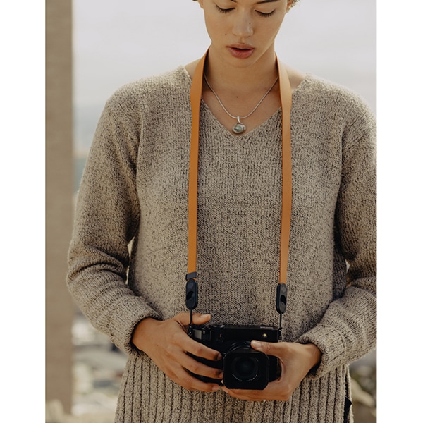 「フォーム レザー」は、ミニマルでかさばらないシンプルなカメラストラップです。柔らかく耐久性に優れ、経年変化を楽しめる上質なフルグレインレザー(牛革)を使用。目に見える縫い目などを削ぎ落とし、時代を超えて愛されるクリーンな外観と使用感を実現しました。