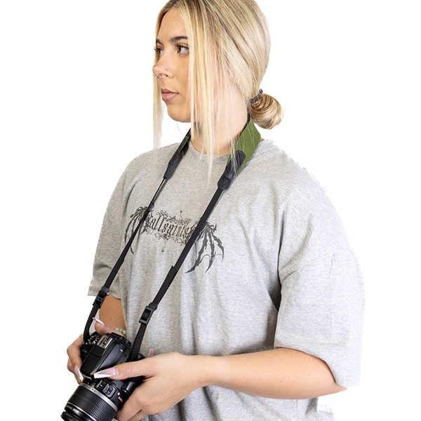 長年定番として人気のオプテックのカメラストラップ。独特のふわふわ素材のネオプレン生地で優しく肩を守ります。