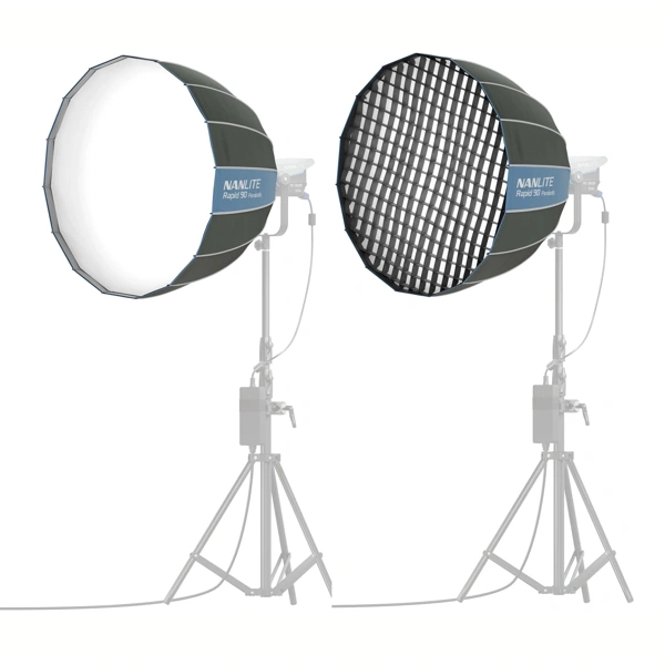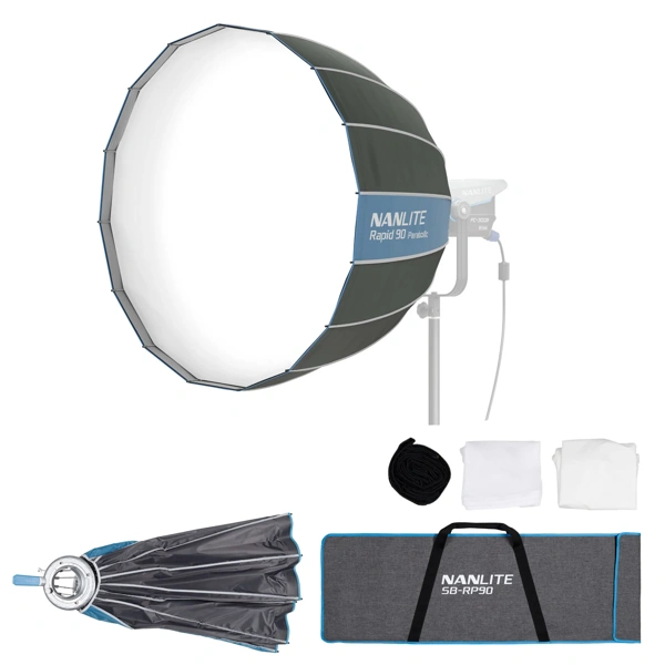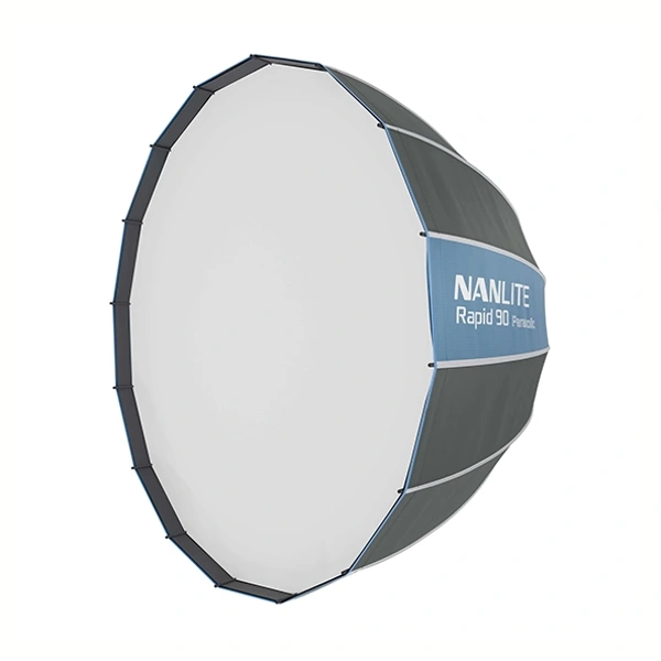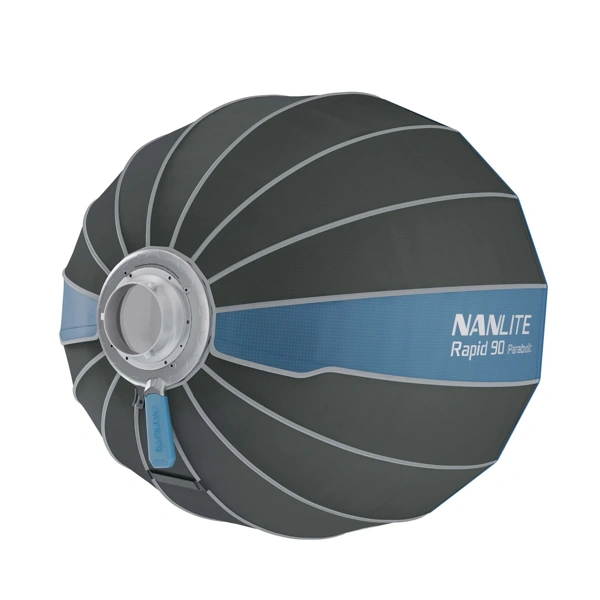 NANLITE SB-RP90は革新的なクイックリリース機構を搭載した直径90cmのソフトボックスです。FS-300BやFC-500BなどのボーエンズマウントLEDライトに装着することで、柔らかで広範囲な光を作り出します。