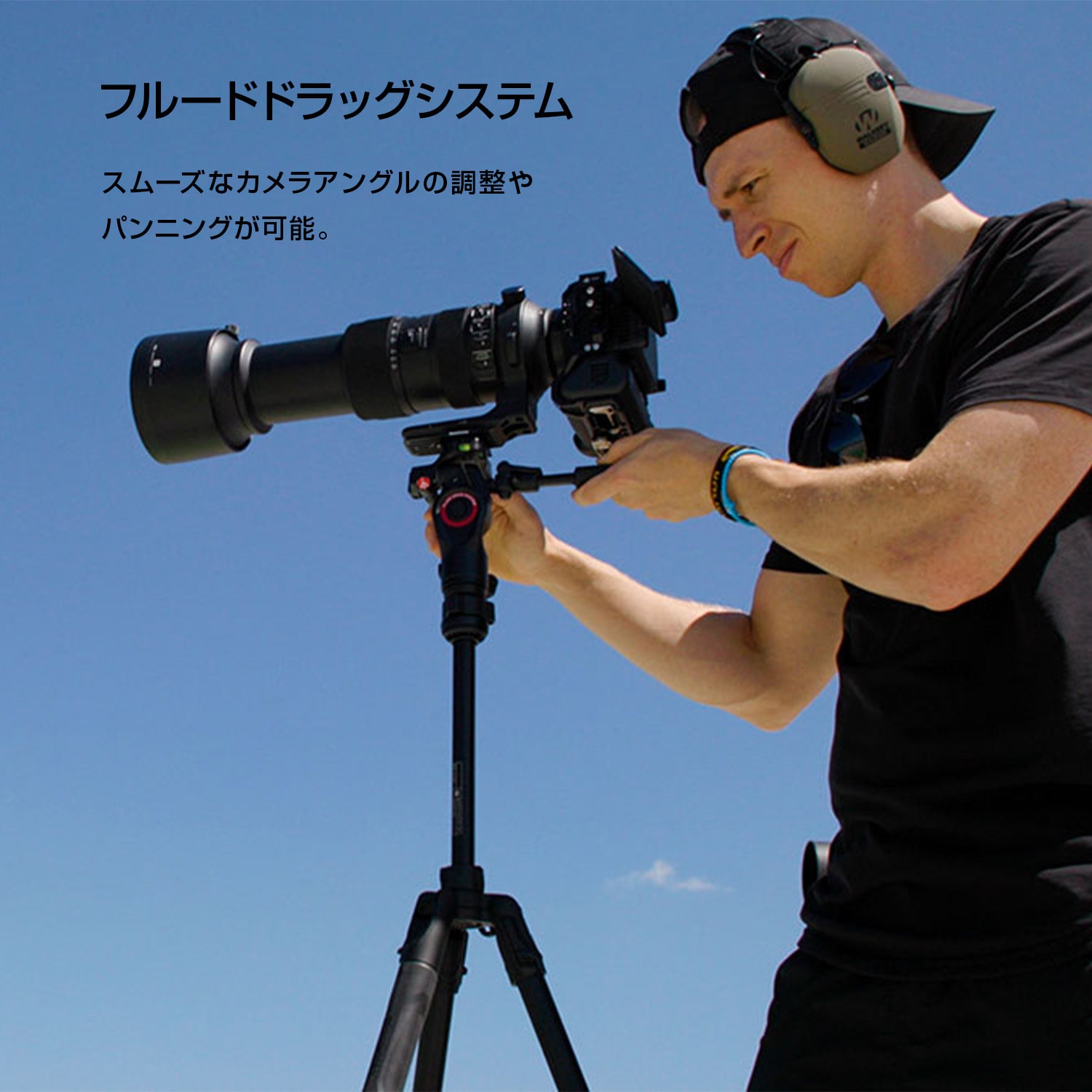 折りたたみ式のパン棒を採用することで、折りたたんだ状態でも三脚自体をすっきりと収納できる 3ウェイ雲台が付属します。可動部分には滑らかなパン・ティルト操作感を得られるフルード機構が内蔵されています。プレートは付属の 200PL-PRO やアルカスイスタイプ互換プレート、マンフロットのビデオ用スライディングプレート 501PL を使用できます。■ 水平出しが手軽なレベリング機構を搭載。アクセサリー装着にも対応し、多彩な撮影に対応