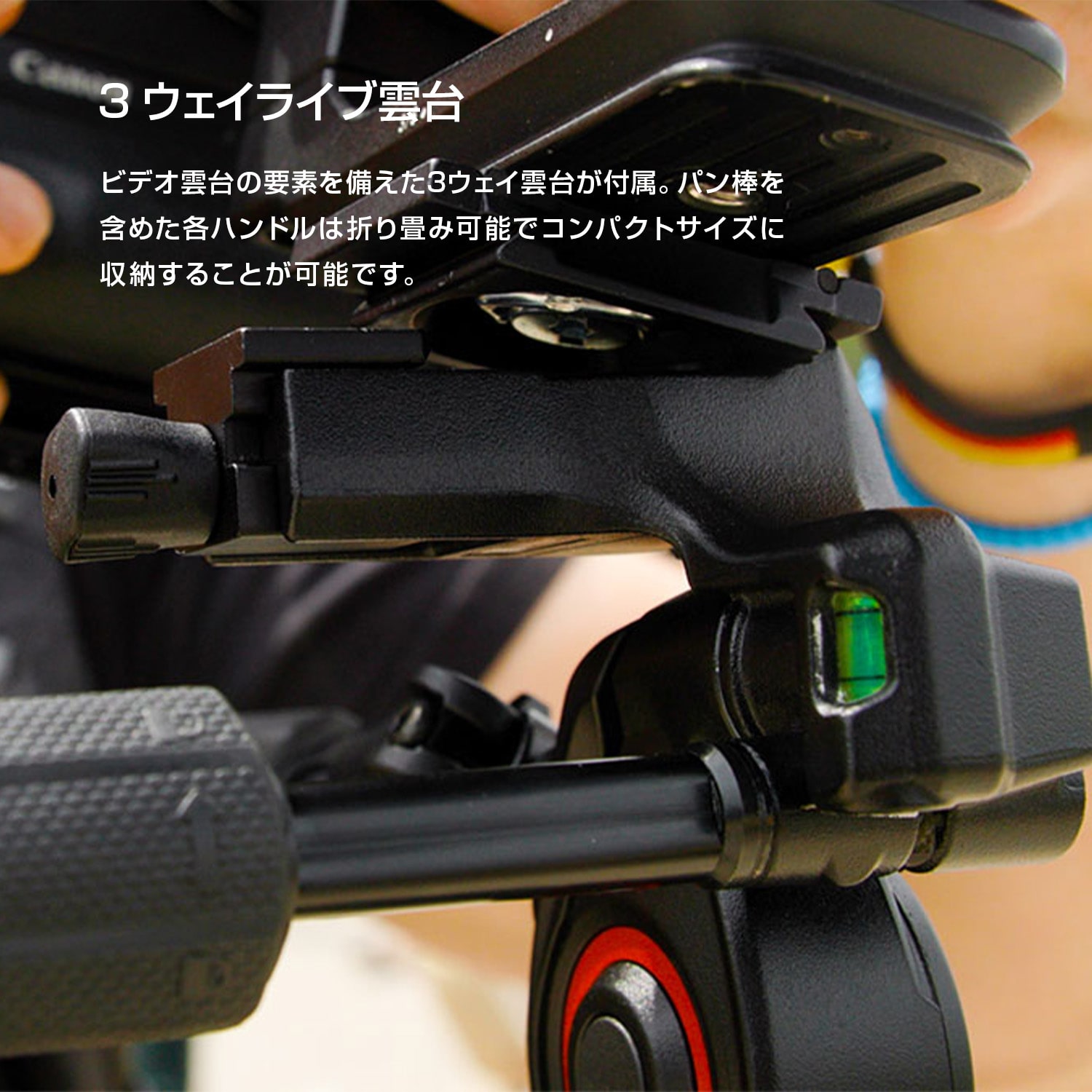 ■ すっきり収納できる折りたたみ式のパン棒。アルカスイス互換プレートも使える 3 ウェイ雲台