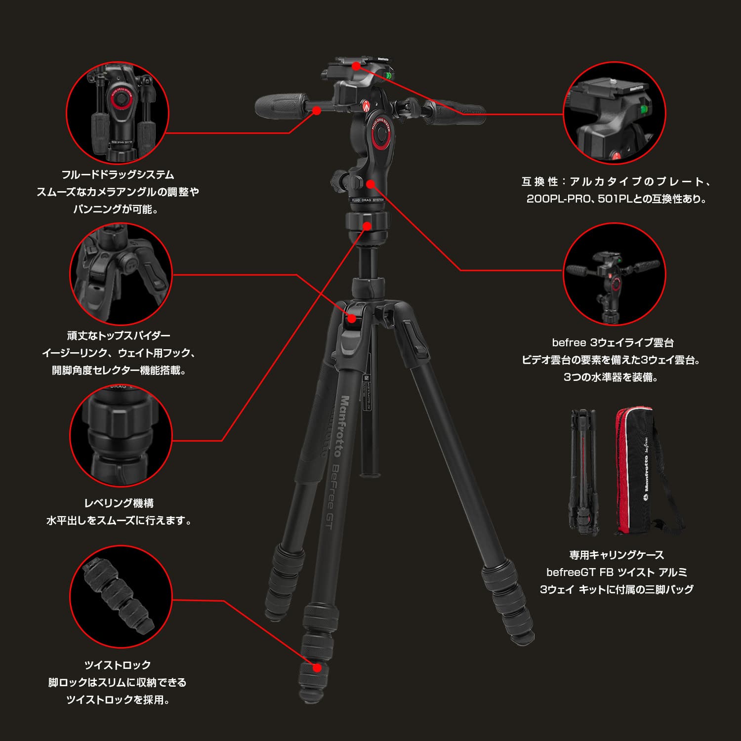 | 項目 | befreeGT FB ツイスト アルミ 三脚 | befreeGT FB ツイスト カーボン 三脚 | befreeGT FB ツイスト アルミ 3 ウェイ キット | befreeGT FB ツイスト カーボン 3 ウェイ キット |