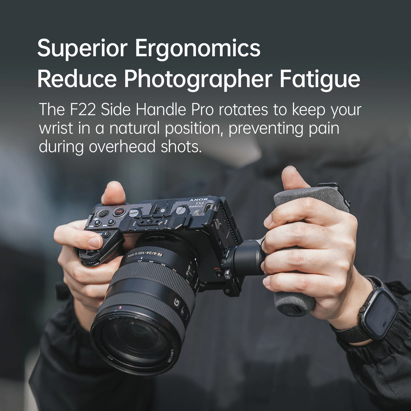 F22クイックリリースに対応した左手用サイドハンドル。ワンタッチで着脱でき、セットアップ変更を素早く行えます。高さ調整と360°回転により、撮影スタイルに合わせた柔軟な操作が可能。ミカルタグリップで安定したホールド感を確保し、長時間の使用でも負担を軽減します。マグネット内蔵レンチ付き。