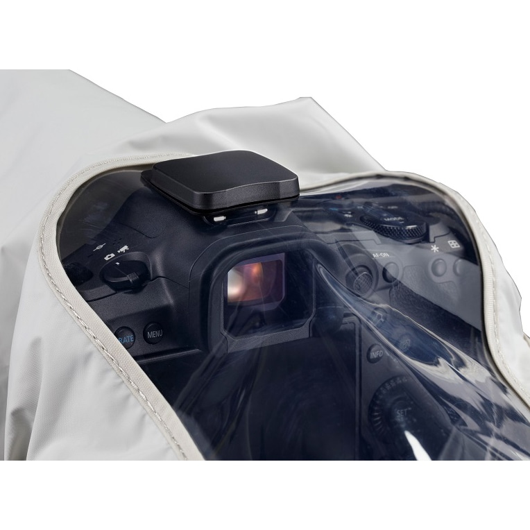 EOS Rシリーズのカメラに対応するレインカバーのLサイズです。カメラのアクセサリーシューに固定して使用し、アクセサリーシューおよびマルチアクセサリーシューに対応しています。