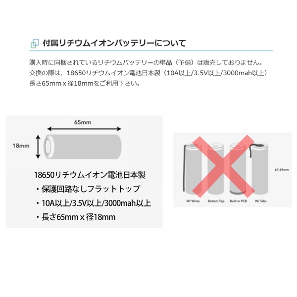 ・本体バッテリー:18650 (3.5V, 3000mAH、フラットタイプ)