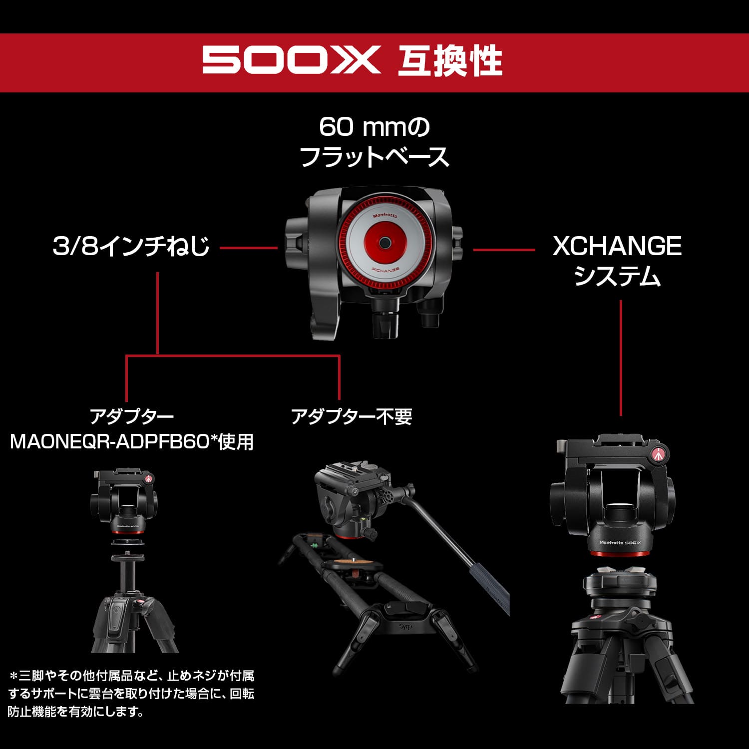 | 雲台ベース | 直径 60mm / Xchange 対応 / 3/8”メスネジ | 直径 60mm / Xchange 対応 / 3/8”メスネジ | 直径 60mm / Xchange 対応 / 3/8”メスネジ | 直径 60mm/Xchange 対応/3/8”メスネジ 560BALLSHX(取り付けて同梱) |