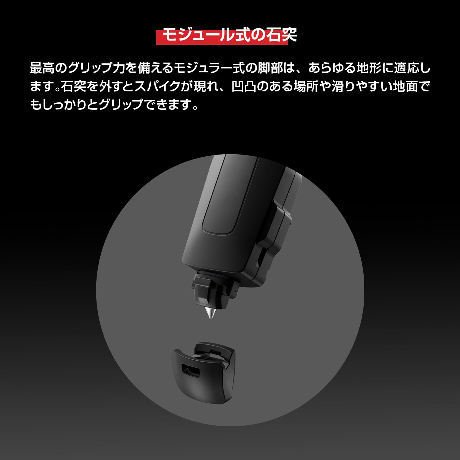 特許取得済みの XTEND 機構により、脚のすべての段をワンアクションで素早くセットアップすることができます。そのため、撮影前の準備時間を大幅に短縮し、より多くの時間を撮影に充てることができるようになります。また、モジュール式脚の石突を外すとスパイクが現れ、凹凸のある場所や滑りやすい場所でもしっかりとグリップ。脚の角度調整機能と組み合わせることで、様々な場所で高い安定性を確保します。