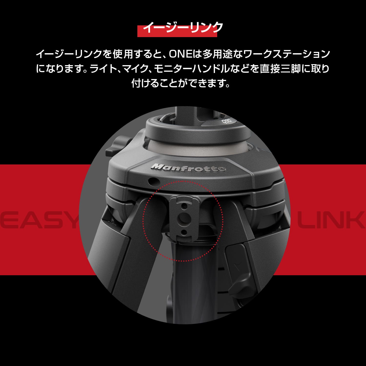 三脚のスパイダー部分には、3/8”メスネジ仕様の「イージーリンクコネクター」を装備。小型アーム等と組み合わせて LED ライトや外部モニターなど、撮影に必要なアクセサリーを簡単に装着することができます。アームのネジが緩む方向に負荷がかかっても容易に緩まないよう、マンフロットの「アンチローテーション機構」や ARRI のピンロックにも対応しています。
