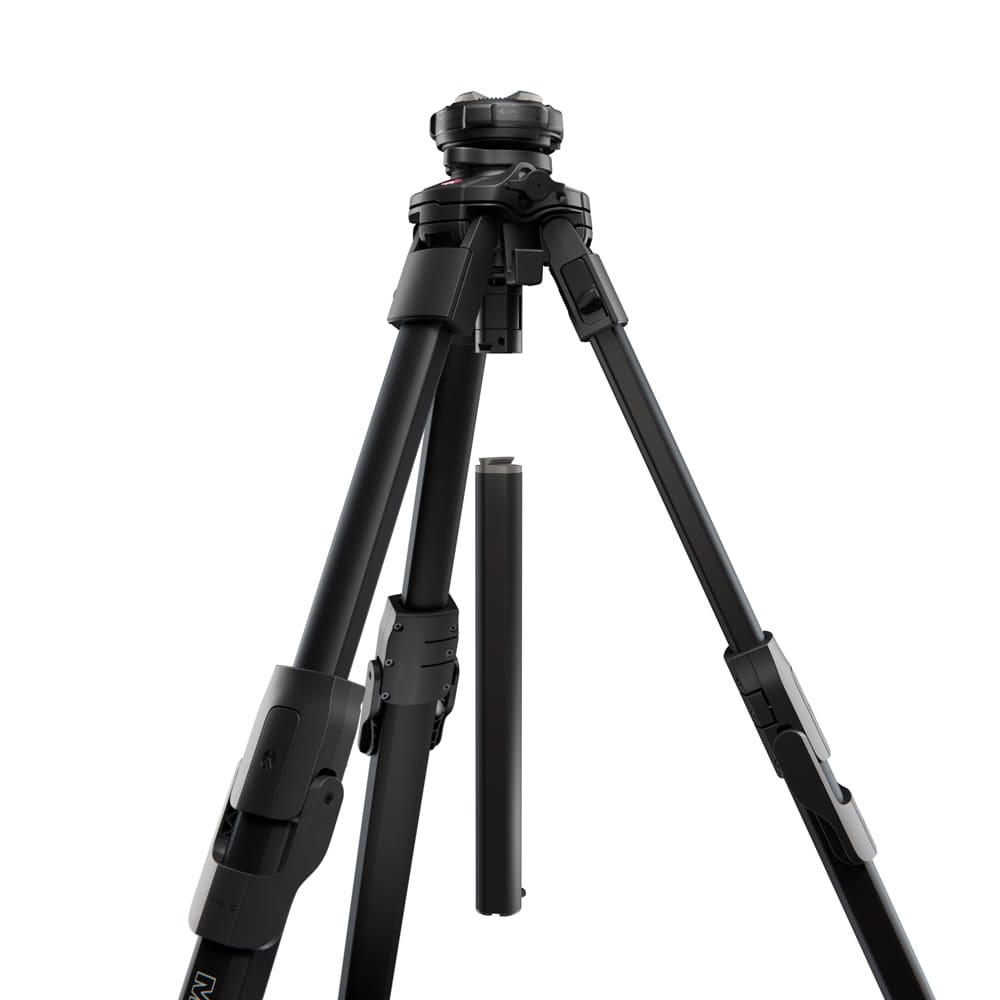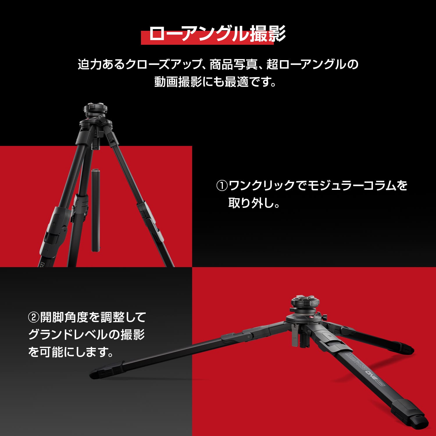 二分割式のモジュラーセンターポールの採用により、下段を取り外して素早くローアングル撮影に切り替えることができ、迫力ある写真や動画を撮影することができます。センターポールの下段を取り外した場合でも、レべリンク機構は使用可能です。