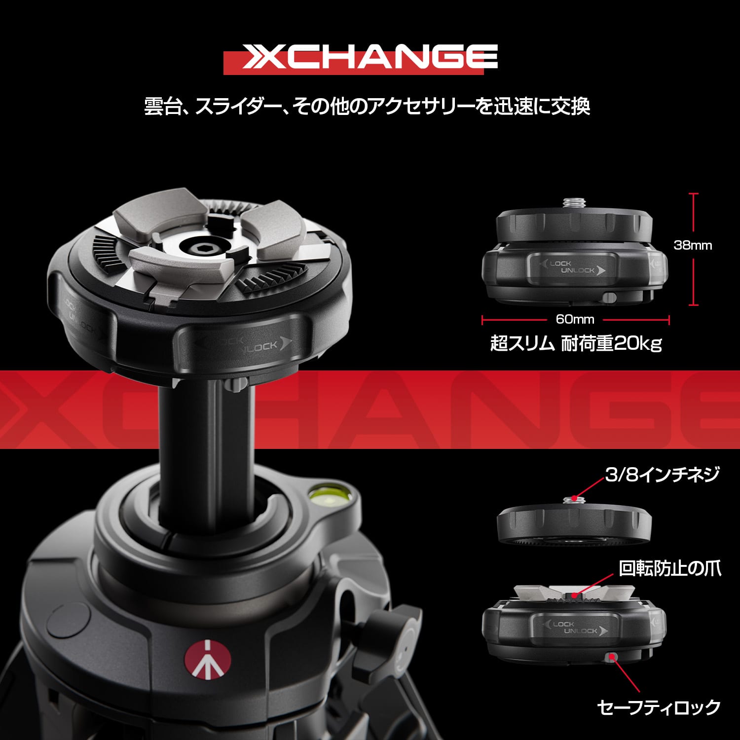 新開発の Xchange クイックリリースシステムにより、雲台やスライダー、各種アクセサリーの取り付け・取り外しを数秒で完了することができます。撮影スタイルに応じた機材の切り替えがスムーズに行えるため、写真撮影から動画撮影への移行もスピーディーに対応可能です。さらに Xchange クイックリリースシステムには、雲台などの不用意な脱落を防ぐロック機構を搭載。