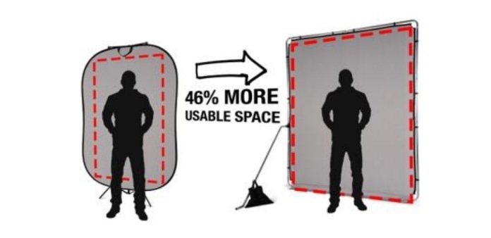 キットには持ち運び用の丈夫なキャリングケースが付属しており、ロケなどの撮影場所が変わる場合でも手軽に携帯することができます。省スペースでの使用が可能なため小規模なスチル撮影や動画配信用の背景としても最適です。カバーを交換するだけで背景の色を容易に変更することができます。方形デザインのため、楕円形の背景(2.1mX1.5m)と比べて有効面積が約46%広くなっています。