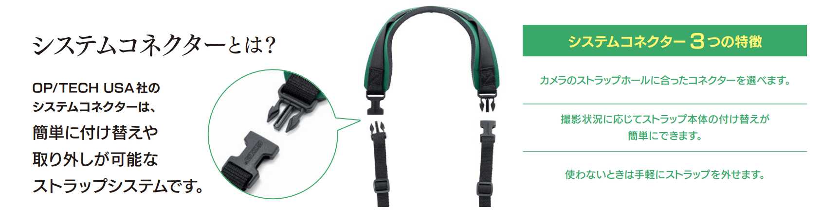 | プロ ループ | ![]() あらゆるストラップ取り付け部分にマッチするシステムコネクターです。長さ調節も可能。2個1組。 |