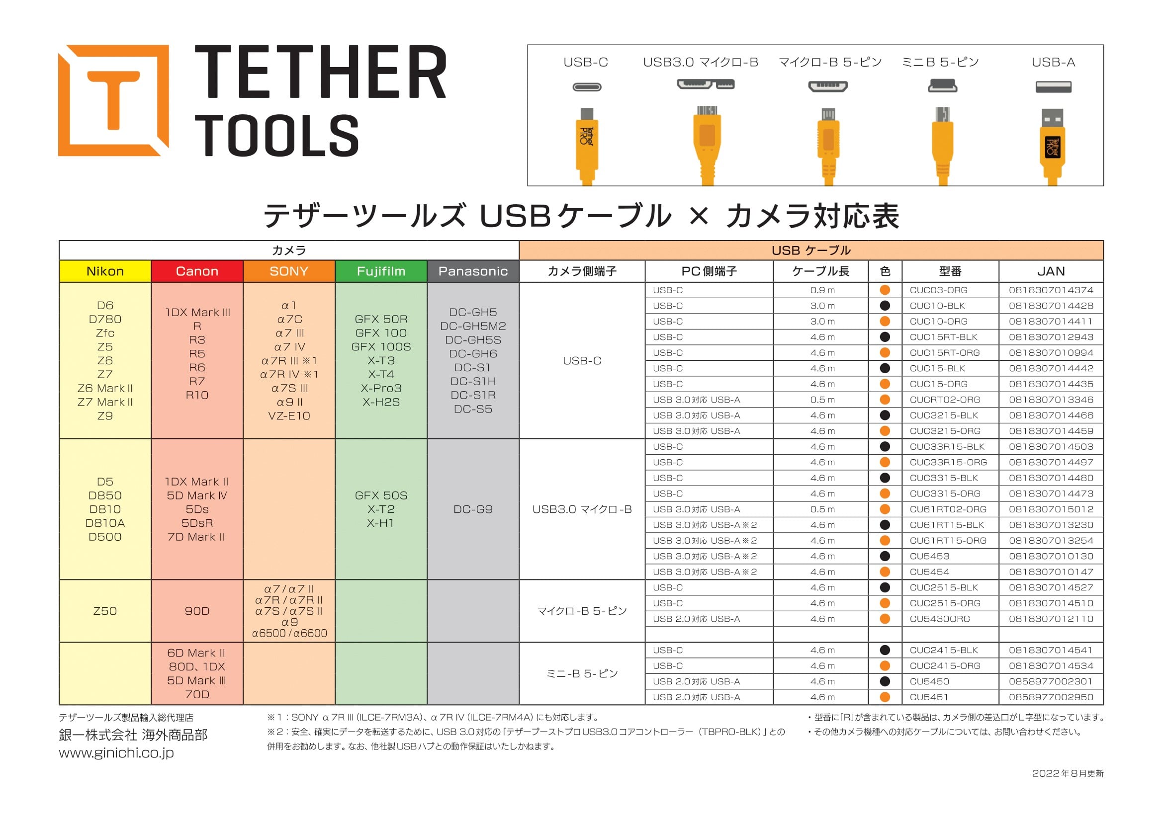 【TETHER TOOLS】ケーブル端子&カメラ対応表
