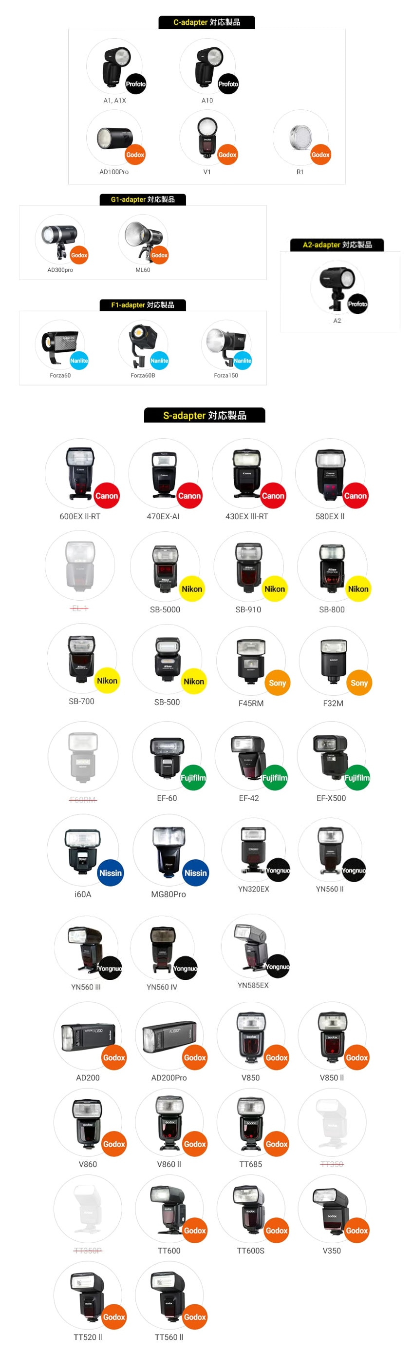 ストロボとアダプターの互換性は、下記の画像よりご確認お願いいたします。