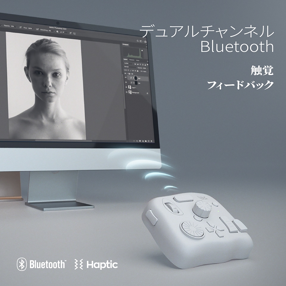 マウスを使わず、ノブだけであらゆるスライダーを調整。写真のスポット修正、輪郭修正、レタッチはまるでカジュアルゲームのように。
