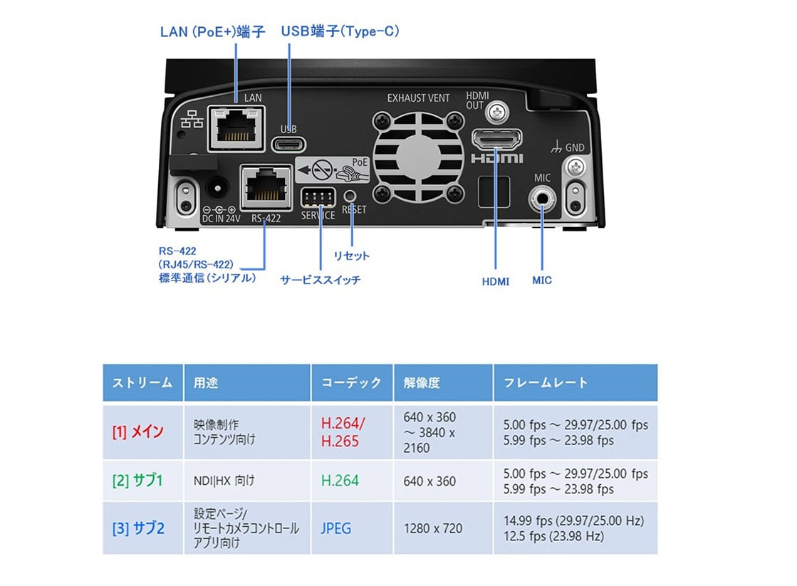 | IP | 3840 × 2160 : 29.97 fps、14.99 fps、5.00 fps (4:2:0 8 bit) 1920 × 1080 : 59.94 fps、 29.97 fps、14.99 fps、5.00 fps (4:2:0 8 bit) 1280 × 720 : 59.94 fps、 29.97 fps、14.99 fps、5.00 fps (4:2:0 8 bit) 640 × 360 : 59.94 fps、 29.97 fps、14.99 fps、5.00 fps (4:2:0 8 bit) フレーム周波数に59.94/50.00 Hzを選択した場合、3840 × 2160のフォーマットを選択することはできません。 フレーム周波数を超えるフレームレートは選択することができません。 JPEGはフレーム周波数によって1 パターン固定 (フォーマットは固定で選択することはできません) 解像度 : 1280 × 720 フレーム周波数59.94/50.00 Hz選択時 : 14.99 fps、フレーム周波数23.98 Hz選択時 : 11.99 fps、フレーム周波数29.97/25.00 Hz選択時 : 12.50 fps | ||