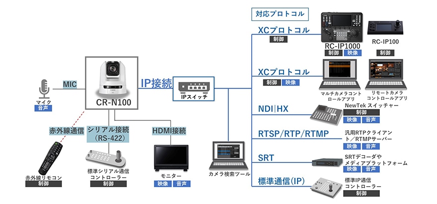 CR-N100は、高速から低速まで多段階の速度変化が可能な高精度なPT(パン/チルト)駆動機構とズームを連動させた「スムーズPTZ」を搭載。同梱の赤外線リモコンや、リモートカメラコントロールアプリでの操作に加え、全方向に対応するコントロールレバーが搭載された、リモートカメラコントローラー「RC-IP100」「RC-IP1000」でのカメラ操作にも対応。