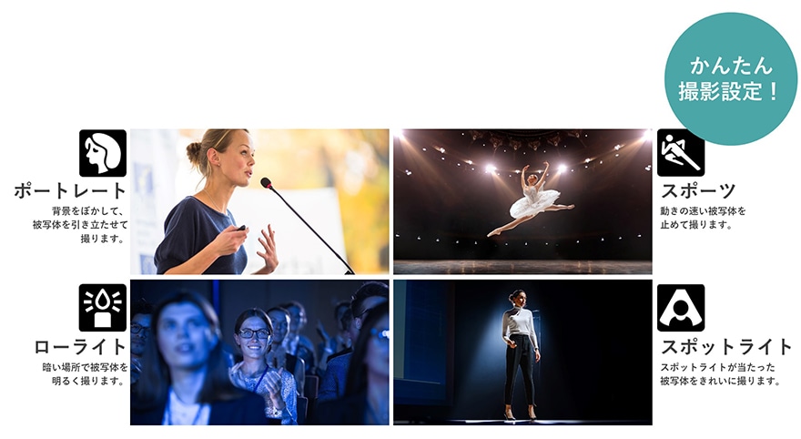 カメラの細かな設定に不安がある場合も安心のシーンモードを搭載。選べる4モードで、撮りたい被写体に適した撮影モードが選択可能です。シーンモードを使用することにより、細かな設定をすることなく撮影ができ、映像制作用途にも使用可能な印象的な映像表現が可能となります。