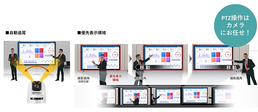 自動追尾アプリケーションRA-AT001(有償)で人物の動きに合わせた自動追尾撮影が可能です。さらに優先表示領域を指定することで、黒板やホワイトボードを写し続けながら、人物を追尾撮影することも可能です。