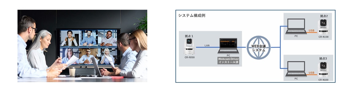 また、Web会議のアプリケーションがインストールされているPCと接続すれば、Webカメラとして使用することもできます。フルHD映像の高品質な映像によるWeb会議の開催が可能です。
