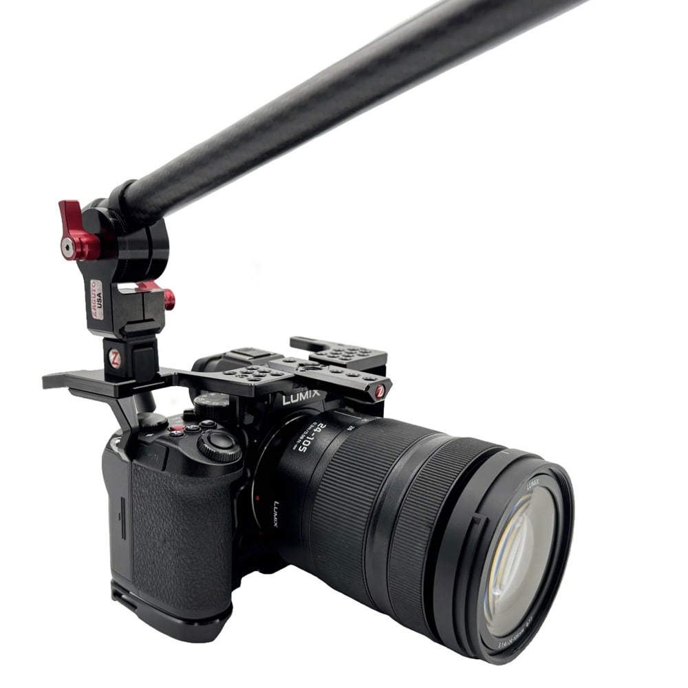 一眼レフカメラやミラーレスカメラなどのコールドシューに設置して、ザクートの「マイクロブーム」を取り付けられます。
