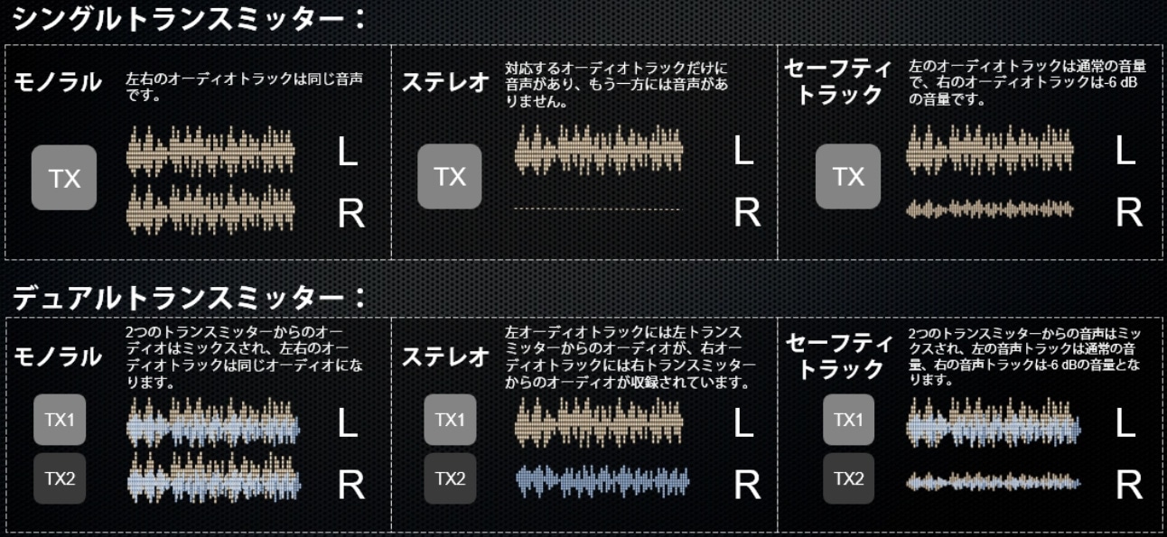 | トランスミッターまたはレシーバー1台のバッテリー寿命 | 各トランスミッターおよびレシーバーの動作時間は6時間です。 |
