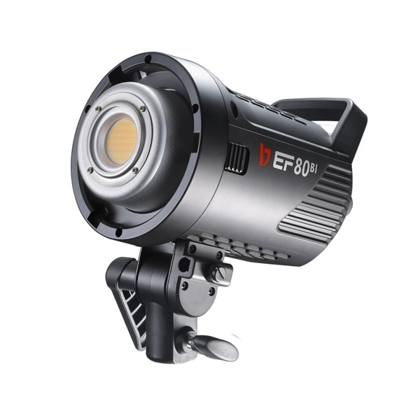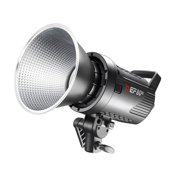 照度は1m、5500K、リフレクター使用で22500 lx、2700~6500Kで色温度調整可能なBi-Colorタイプです。本体は0.94kgと軽量コンパクトサイズでありながら、タングステンランプ800Wに匹敵する高輝度80Wの大光量LEDライトです。