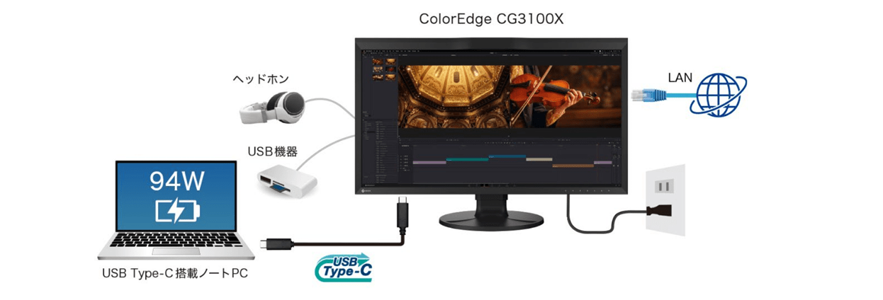 付属のUSB Type-Cケーブル1本のシンプルな接続で、画面表示、USB信号の伝送、PCへの給電、安定した有線LAN接続を実現します。 CG3100Xは、当社モニターにおいて最大となる94Wの給電に対応しています。MacBook ProなどのハイエンドノートPCを用いた高負荷がかかる作業時でも給電が可能です。 また、有線LANポートを新規に搭載しました。有線LANポートを搭載しないノートPCやタブレット機器でも、モニターを有線LAN接続しておくことで安定したインターネット環境を利用でき、Wi-Fi(無線LAN)では時間のかかる大容量のデータの送受信も快適です。 筐体側面には4つのUSBポートが使いやすく配置されています。近年のUSBポートの少ないノートPCとの接続時に便利です。