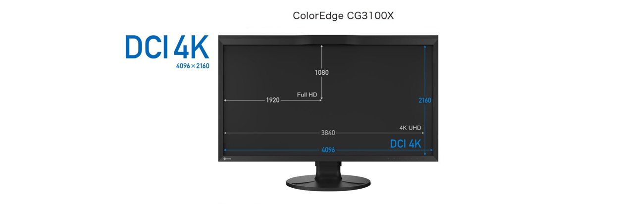 デジタルシネマ規格であるDCI 4K解像度4096×2160に対応。フルHDの4倍を超える大画面で、4K映像はもちろん、フルHD解像度のコンテンツを複数並べて確認作業が行えます。