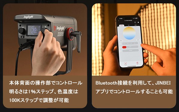 通常は本体背面の操作部で操作しますが、Bluetooth機能を搭載しており、JINBEI公式アプリをダウンロードして本体とスマートフォンをペアリングすることで、遠隔コントロールもできます。高所に設置した場合などに大変便利です。