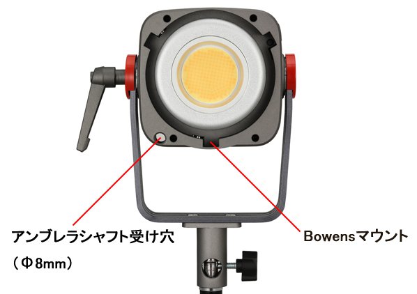 付属のリフレクターを取り付ける部分はBowensタイプなので、別売のソフトボックスをはじめ、様々なアクセサリーを取り付けることが可能です。また、発光部の左下にはアンブレラシャフト受け穴(Φ8mm)も装備しており、別途アダプターを用意することなくアンブレラバウンスをすることができます。