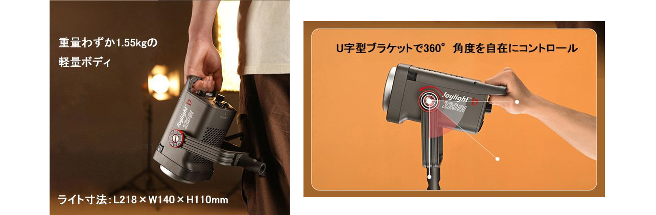 本体はわずか1.55kg、L218×W140×H110mmで、軽量コンパクトな使い勝手の良いサイズ感も魅力のひとつです。またU字型ブラケットを採用し、リフレクターを外すとほぼ360°回転するので、角度を自在にコントロールすることが可能です。