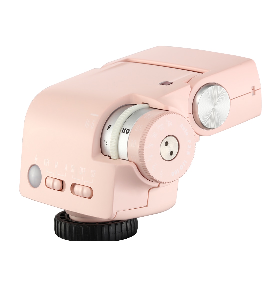 ダイヤルを回して出力を設定するアナログな操作が逆に新しい、ニューレトロなデザインの小型スピードライトです。ブラック、グレー、レッド、ピンク、ブルーの5色のバリエーションを揃え、携帯性に優れたかわいらしいサイズ感も相まって、どこにでも持っていきたくなる1台です。【最大出力26Ws、GN16。選べる4つのモード】
