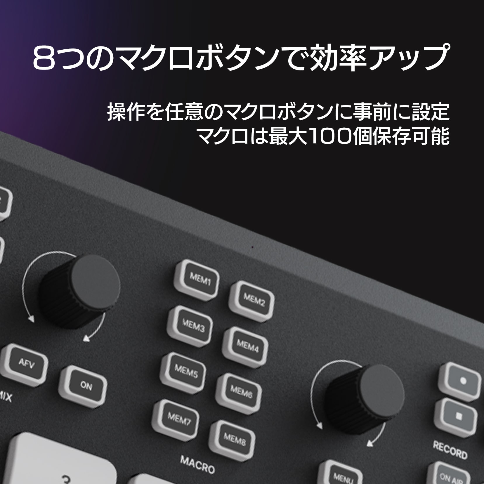 本体に8つのマクロボタンがあり、操作を任意のマクロボタンに事前に設定できます。なお、マクロは最大100個保存しておくことができます。また、Tバーも備えているため、手動でのトランジションも可能です。【スーパーソース機能を搭載】