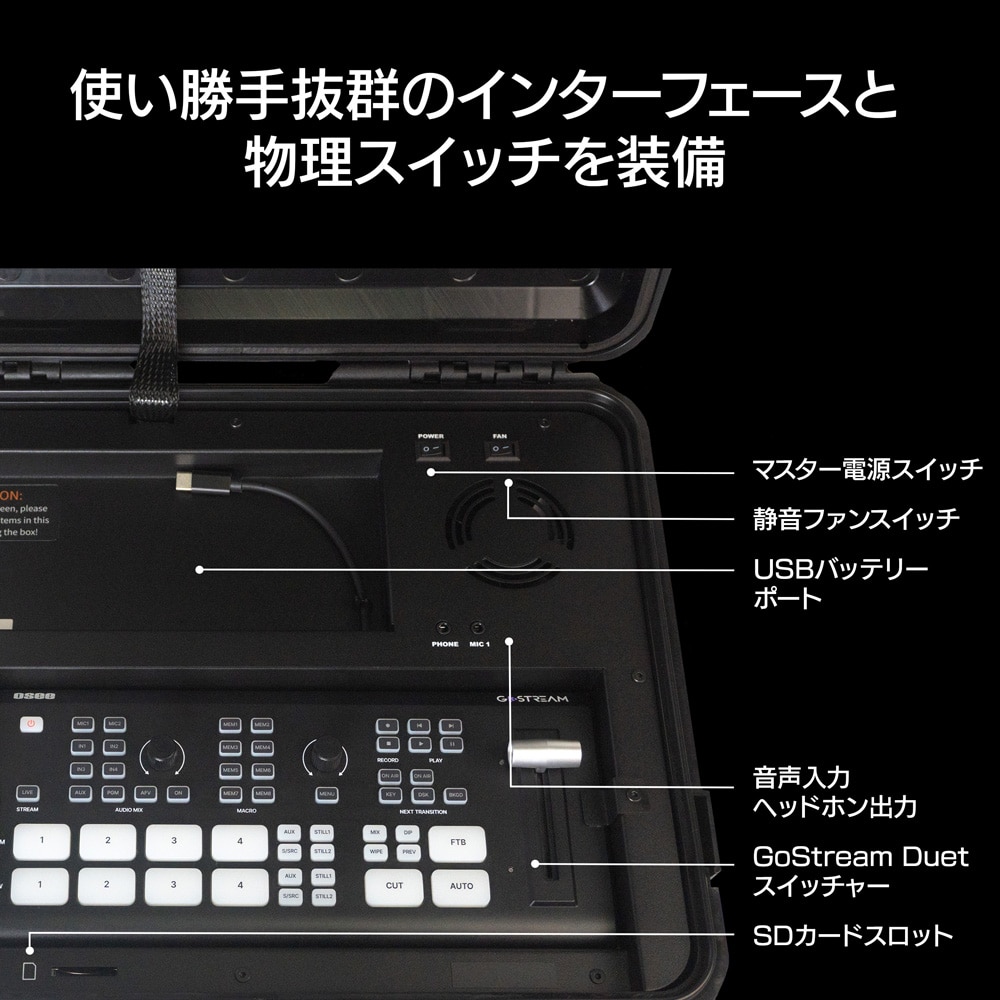 モバイルバッテリーでの動作も可能で、これ1台で、どこでもすぐに本格的な配信を叶えます。