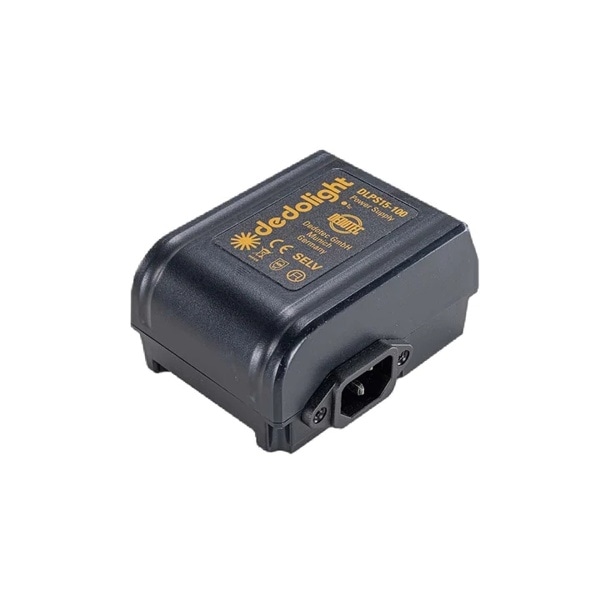 DLPS15-100 AC アダプターは、すべての dedolight NEO バラスト (DTN、DTN+、および DTN7C+ モデル) の V マウント プレートで動作します。